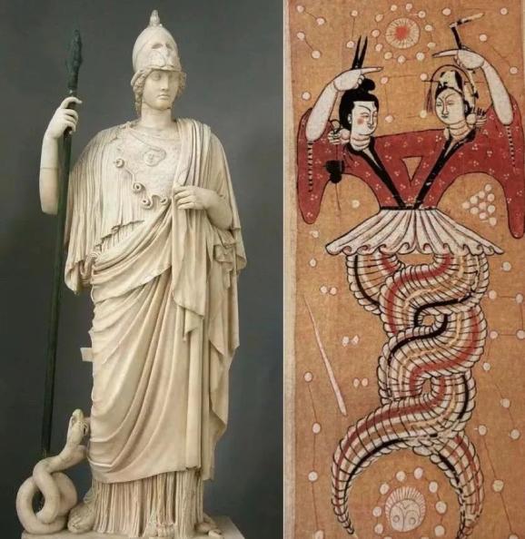 雅典娜与女娲伏羲华夏先民对蛇的尊崇最早可追溯到上古时期。《山海经》中记载:从开天辟地的盘古到人类始祖女娲、伏羲、轩辕黄帝等均“人首蛇身”形象,具有神圣的力量与不可亵渎的内涵。