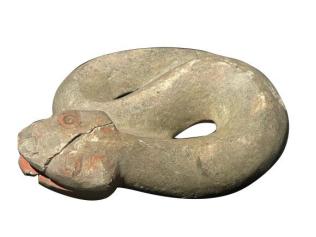 三星堆出出土石蛇而在距今5000多年前红山文化中,辽宁省凌源市田家沟红山墓地群M9中,曾出土一件蛇形耳饰,出土时位于墓主的右耳下方,在红山玉器中堪称孤例。