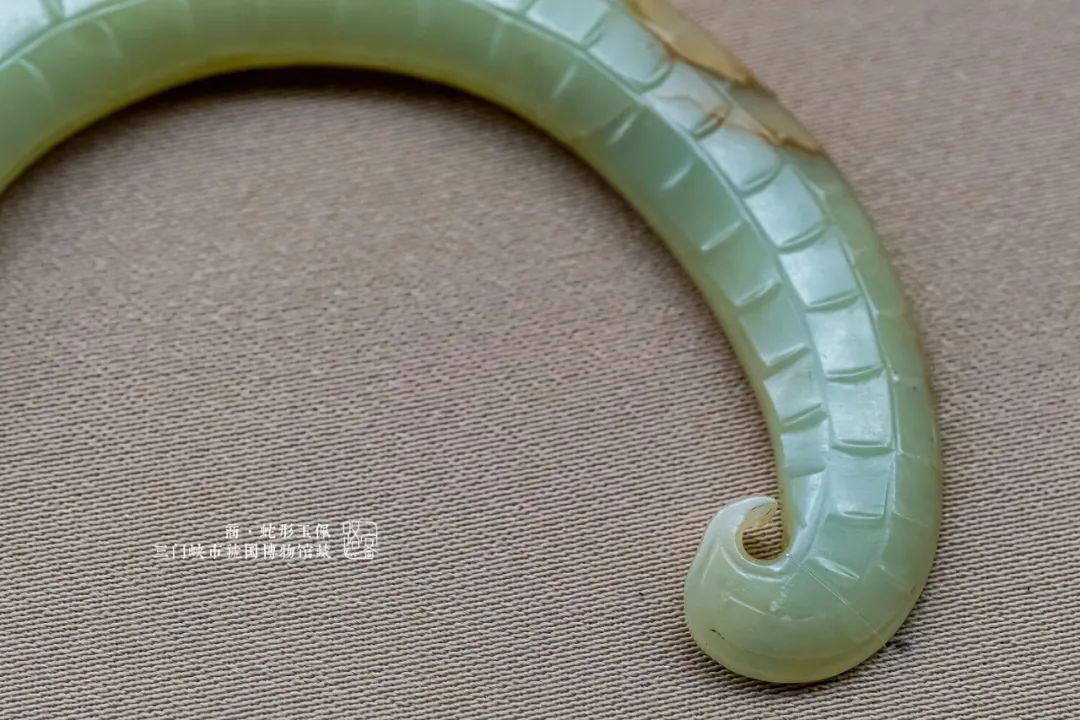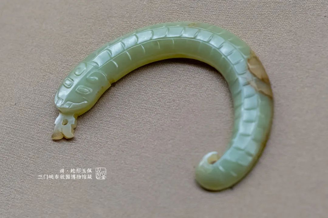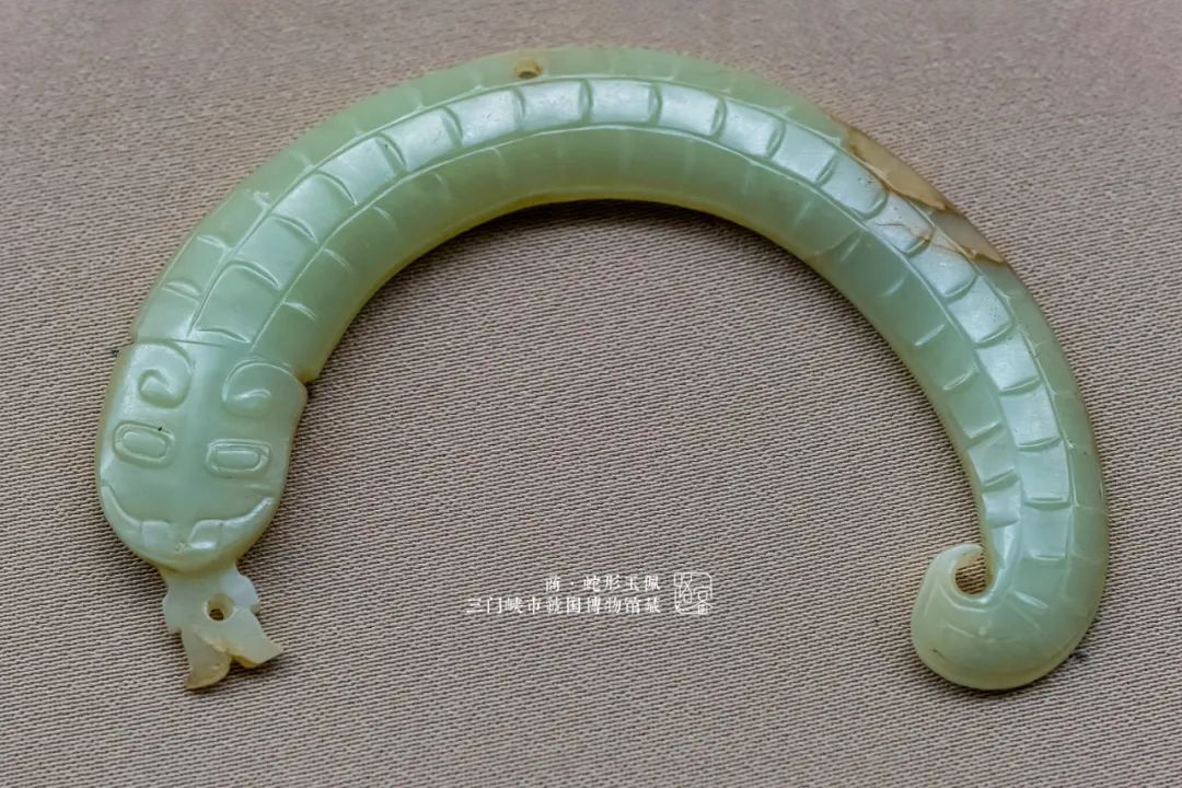 长约10厘米,青玉质地,温润剔透,局部有黄褐色沁。整体呈弧形弯曲状,头部双眼减地起阳线,中间略微出脊,眼后减地似角状,背部平行的多节三列阳线,表示蛇的鳞片,属于典型的商代晚期风格。