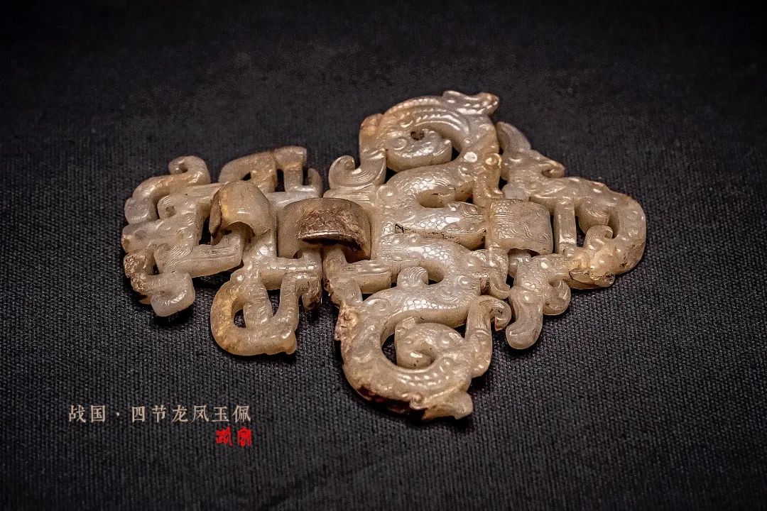 由一块玉料雕琢成可以活动卷折的4节,共雕刻出7条卷龙、4只凤鸟和4条蛇。本件出自墓主腹部位置,器形与其他玉佩不同,可能用于单独佩带。