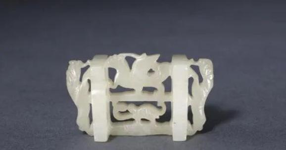玉质钙化严重,钩首弯曲,作龙首回首状。钩身略呈扁平方形,其以一个绞丝纹圆环为中心 ,圆环中部为一椭圆形浅浮雕,上面阴刻细密的斜方格纹。