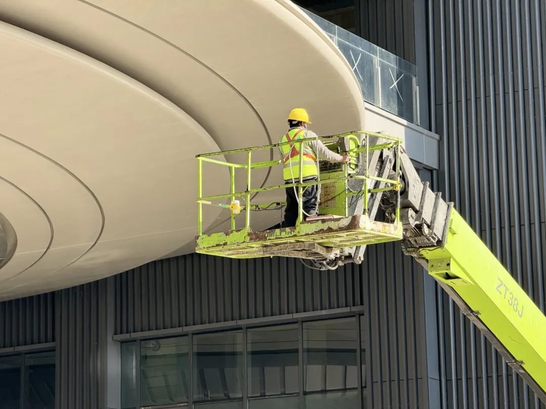 在施工现场的另一边,南京阿里中心标志性的亲橙Hub“飞碟”造型安装工作也即将告竣,工人王江伟正与工友们齐心协力加速推进扫尾进程。升降机将板材送至20多米的“飞碟”顶部,他们小心翼翼将其卸下,放置到预定位置,并用螺丝仔细固定。