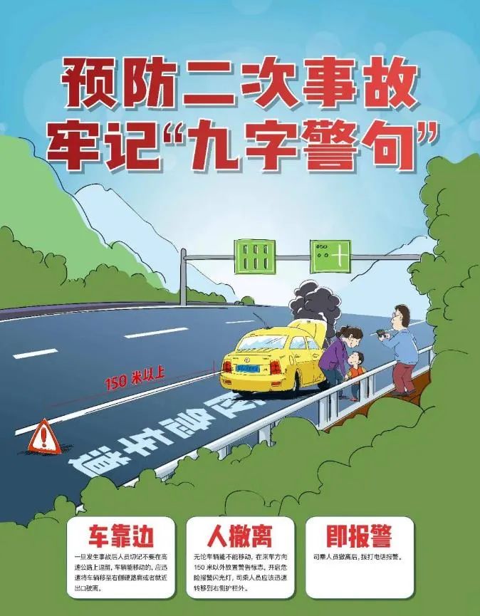 8.高速公路上随意停车容易引发二次事故。车辆在高速公路上发生故障或交通事故,谨记“车靠边、人撤离、即报警”,立即开启危险报警闪光灯,在来车方向150米处摆放警告标志,车上人员迅速撤离至护栏外安全地点,打电话报警等待救援。