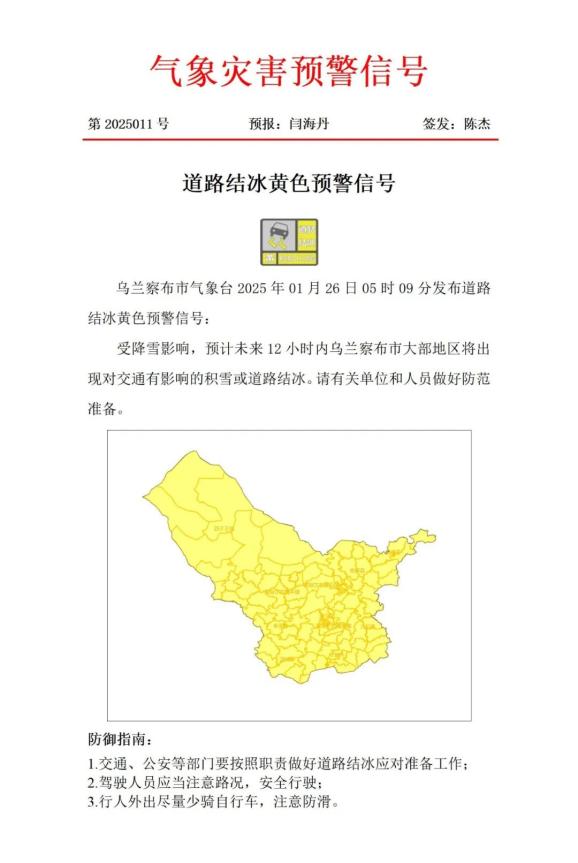 乌兰察布市气象台2025年1月26日5时9分发布道路结冰黄色预警信号:受降雪影响,预计未来12小时内乌兰察布市大部地区将出现对交通有影响的积雪或道路结冰。请有关单位和人员做好防范准备。