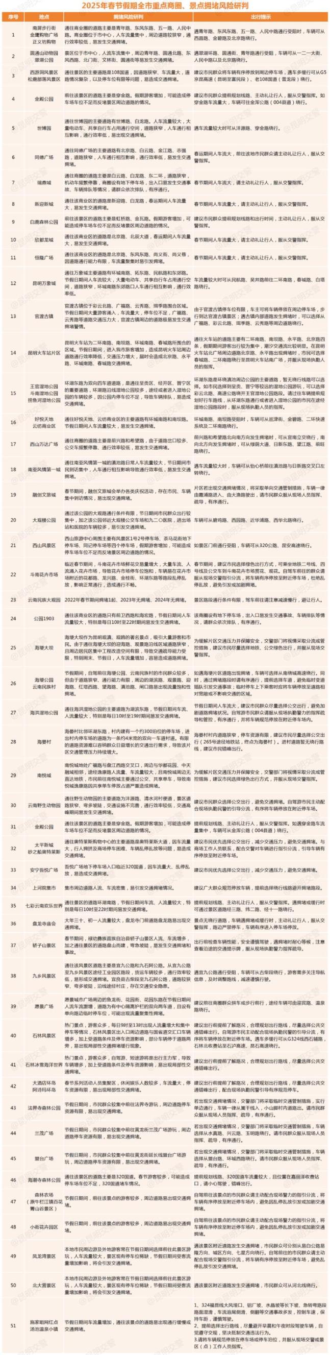 (一)昆明主城区,主要集中于北京路、青年路、人民中路、环城南路、滇池路、二环快速等。2025年春节假期,昆明市重点商圈、景点交通拥堵风险研判及出行提示如下: