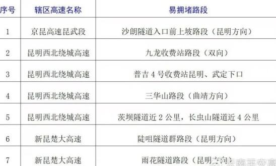 (二)出入昆高速公路易拥堵路段:1.云南省公安厅交通管理总队高速公路一支队辖区: