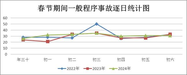 近三年春节假期全省平均每年发生一般程序事故处理的交通事故218起,平均每年发生按简易程序处理的轻微交通事故19991起。近三年春节期间一般程序事故逐年变化不大,轻微交通事故呈现逐年上升趋势。节日期间群众出行增多,交通事故易发、多发。