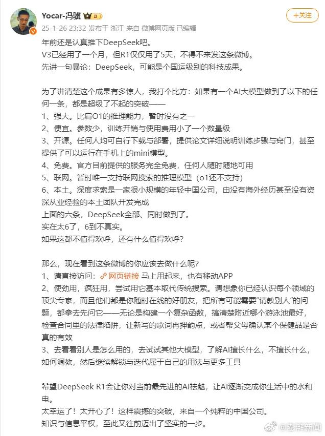 1月26日,《黑神话:悟空》制作人冯骥评价DeepSeek:可能是个国运级别的科技成果。
