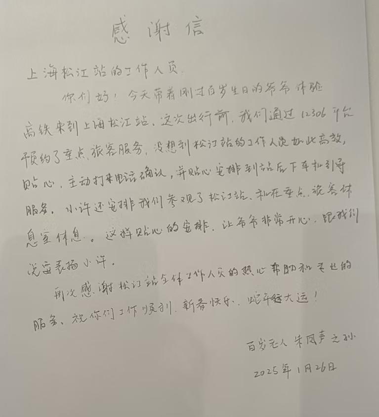 朱爷爷的家属对上海松江站工作人员的热情服务赞不绝口。他们表示,朱爷爷一直对高铁很感兴趣,作为家人他们专门从成都坐飞机过来给朱爷爷过百岁生日,能够在高龄之际实现心愿,多亏了上海松江站工作人员的精心安排和贴心服务。最终,在许悦和同事们的悉心照料下,朱爷爷与家属顺利登上了返回苏州南站的高铁。坐在舒适的座椅上,朱爷爷挥手向许悦道别,眼神中满是感激与不舍。这一刻,整个车厢都被这份温暖的情谊所感染,其他旅客也纷纷为车站工作人员的贴心服务点赞。而对于许悦和其他工作人员来说,看到朱爷爷脸上洋溢出孩童般的笑容,听到那声发自内心的感谢,便是他们最大的满足。满月与百岁,这场跨越时间长河的相遇必将成为彼此难忘的赠礼。上海松江站也将继续秉持这份温暖与责任,成为每一名旅客旅途中的温馨港湾,不断成长的同时与更多个“他们”相遇、重逢。