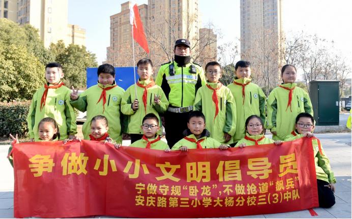 大杨镇为让辖区少年儿童过上快乐安全的寒假,1月20日庐阳区大杨镇草塘社区妇联、团支部、关工委联合合肥市安庆路第三小学大杨分校三(3)中队开展“学交通法规 过安全寒假”活动。在清源路与合淮路交口,合肥交警庐阳大队五中队的交警为小学生介绍交通法规知识,让孩子们安全出行、过快乐寒假。