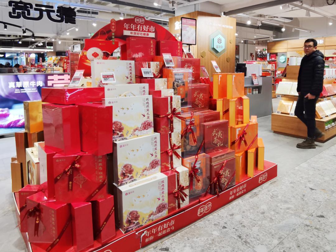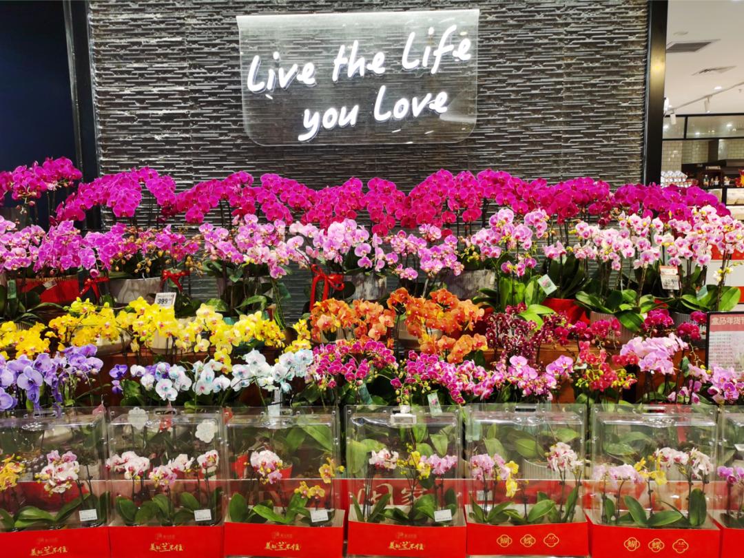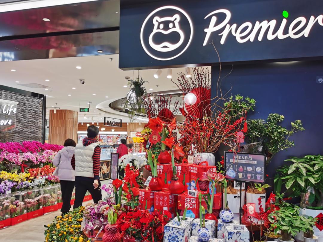 盒马超市货架满满当当“主角”年宵花被放置在主入口