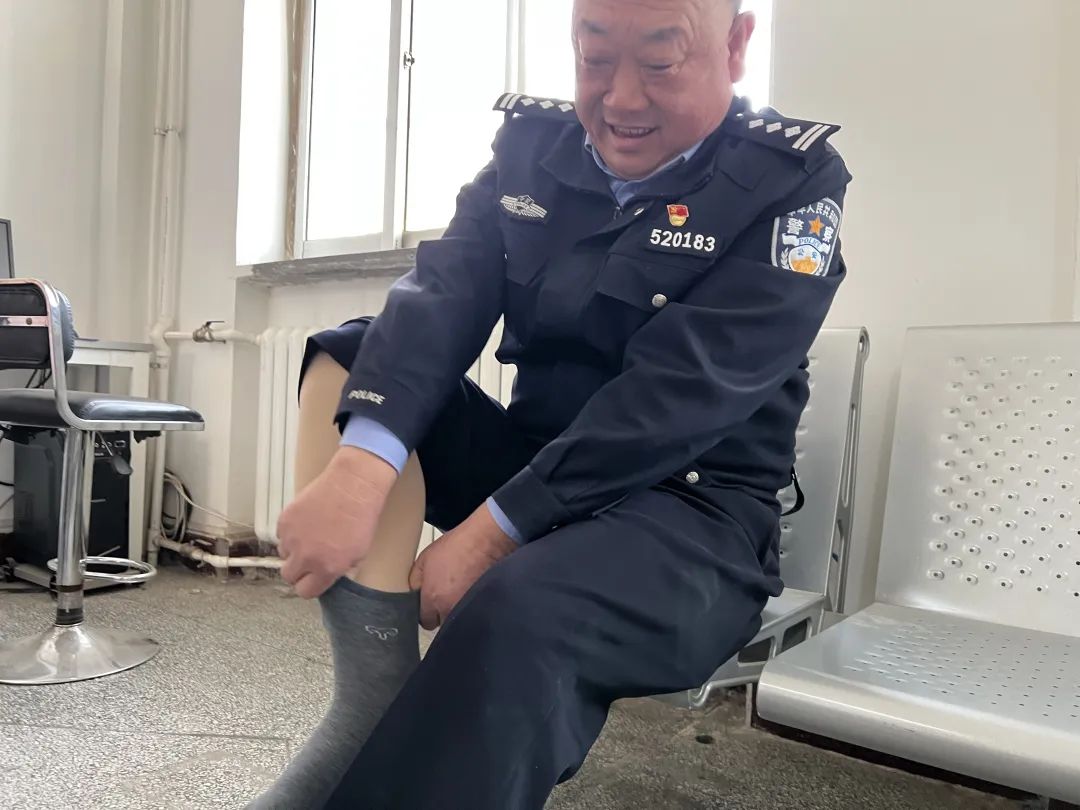 57岁的吴天柱执勤空挡套上他的静脉曲张袜