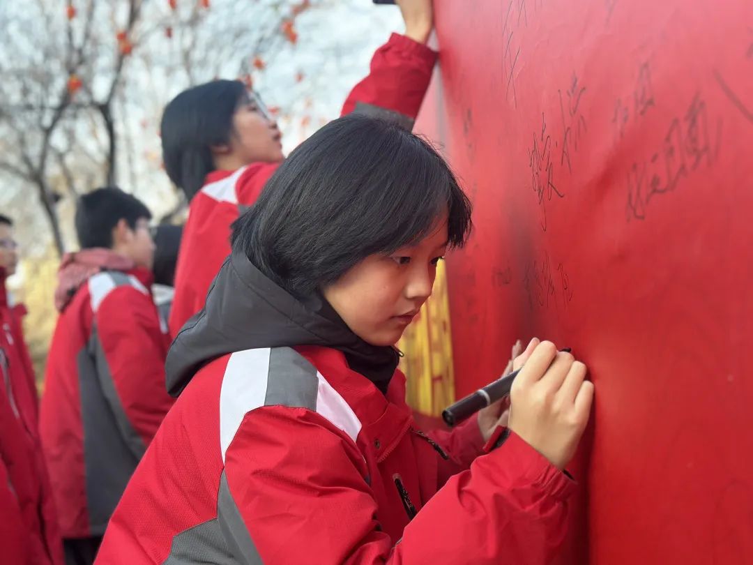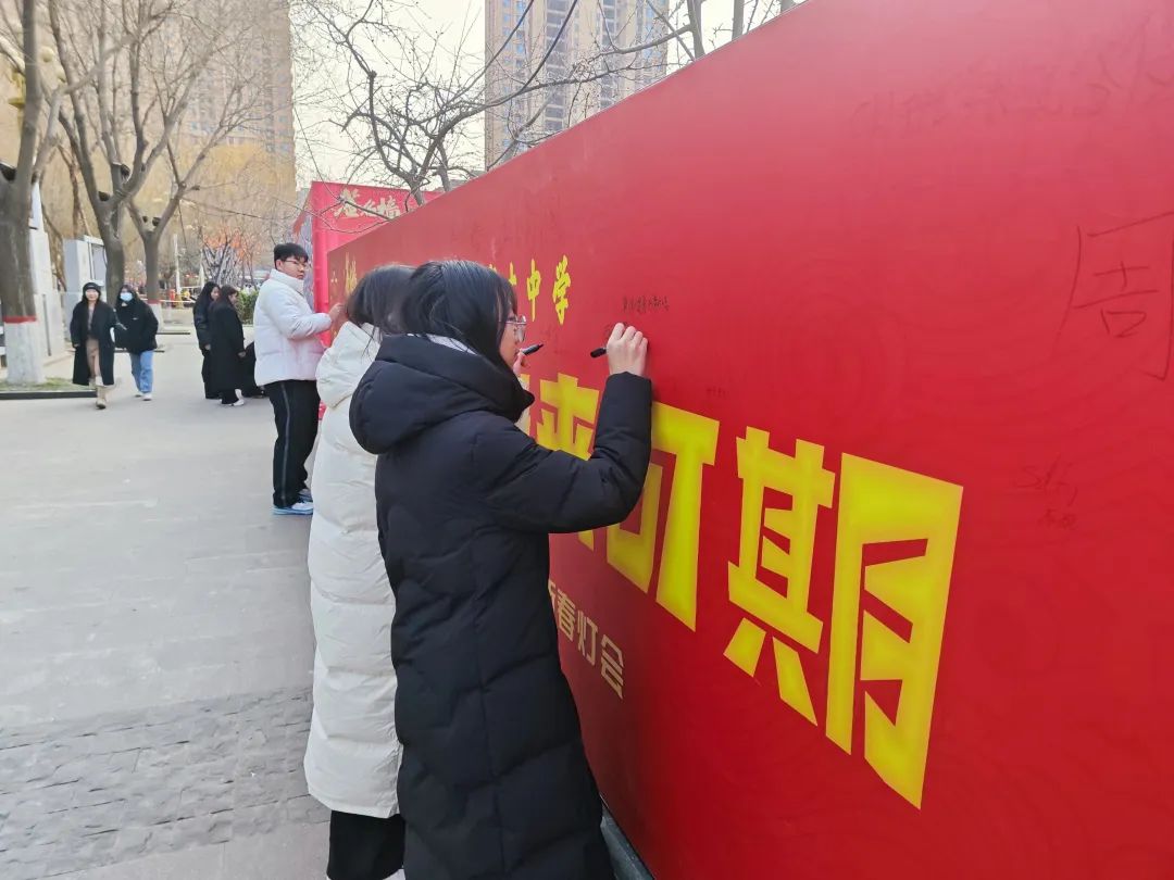 市第一中学的学生们同样热情高涨,他们在毕业墙上留下对母校的祝福,以及对同学的美好祝愿,大家还共同唱响《少年中国说》《明天你好》以及《一中校歌》等歌曲,嘹亮的歌声响彻灯会现场。
