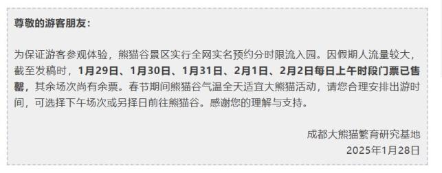 四川成都熊猫谷景区1月30日、1月31日、2月1日每日上午时段门票已售罄,其余场次尚有余票。