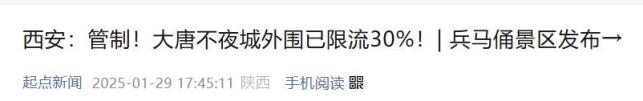 浙江神仙居景区1月30日(正月初二)门票预约已满,将采取限流措施。1月29日晚,大唐不夜城外围已限流30%。秦陵博物院春节部分门票已售罄。
