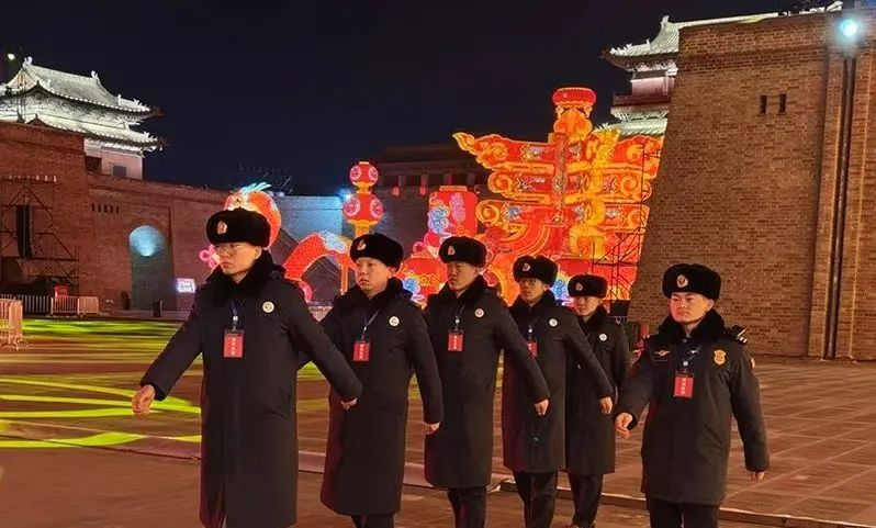 在大同古都灯会现场,璀璨的灯火映衬着大同市消防救援支队平城区大队古城消防救援站队员们坚定的身影。