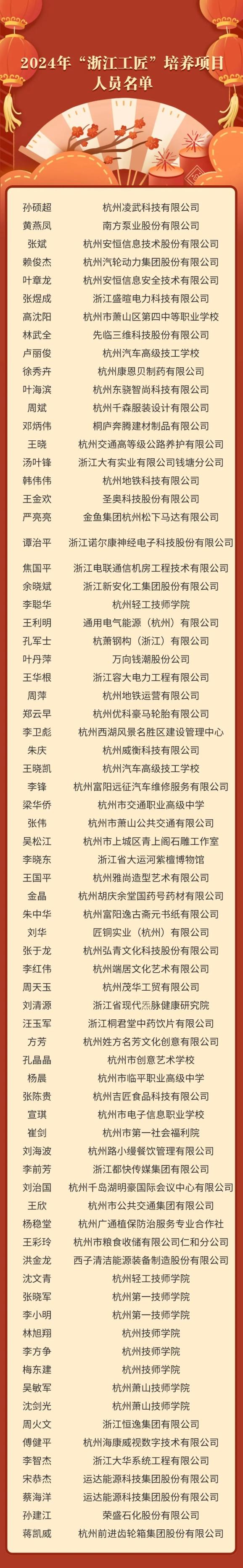 近日,浙江省人力资源和社会保障厅、浙江省总工会、共青团浙江省委联合公布了2024年“浙江工匠”培养项目人员名单,杭州再增73名“浙江工匠”,这是杭州高素养劳动者队伍建设的又一重大成果。截至2024年底,全市拥有浙江工匠365人、浙江青年工匠488人。