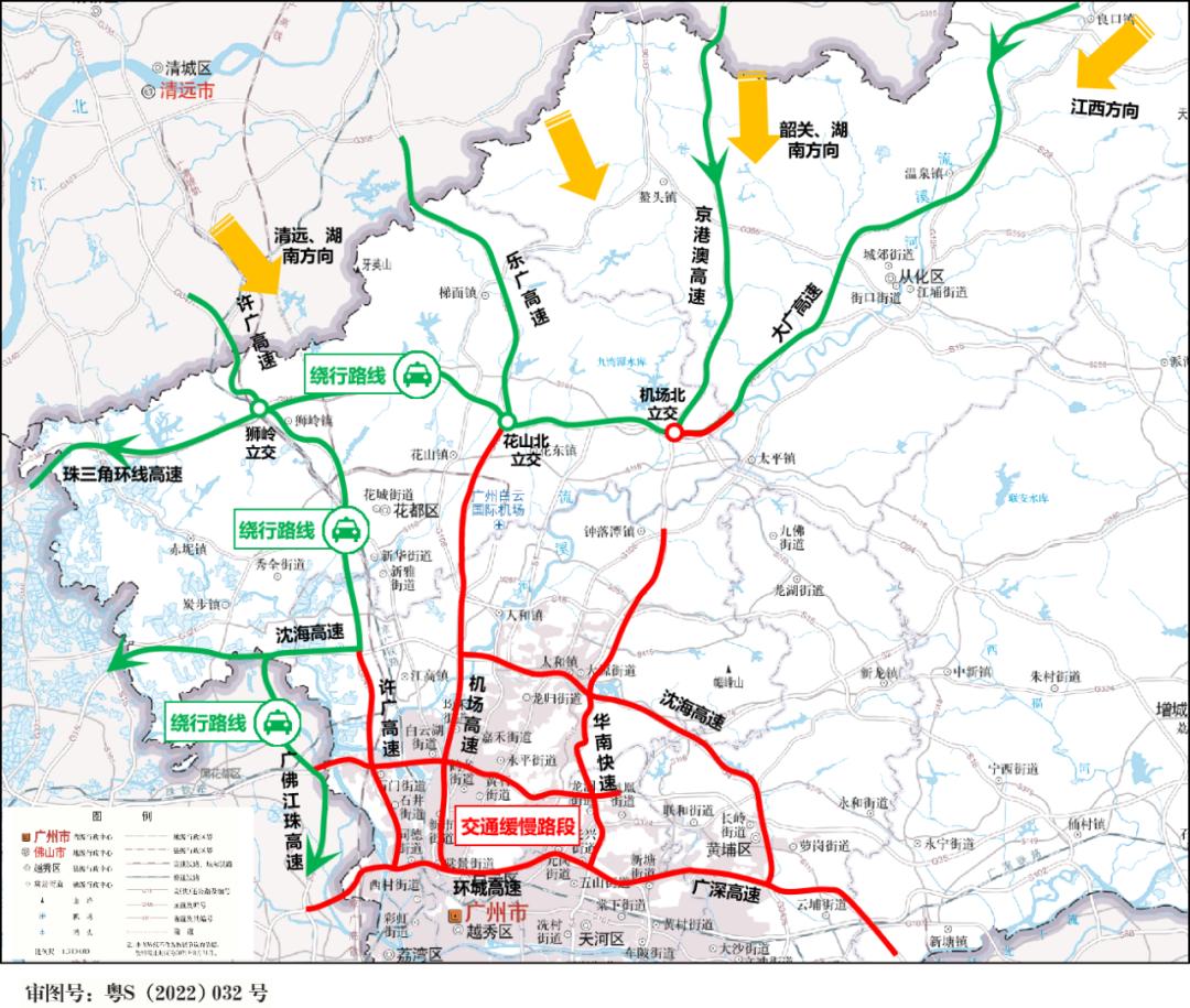 建议来自韶关、湖南方向的车主尽量避开高峰时间返城,高峰期返城的车主可以通过国道G106等地方道路或许广高速、广连高速(连接机场第二高速)进行绕行,避开机场高速行车缓慢路段。