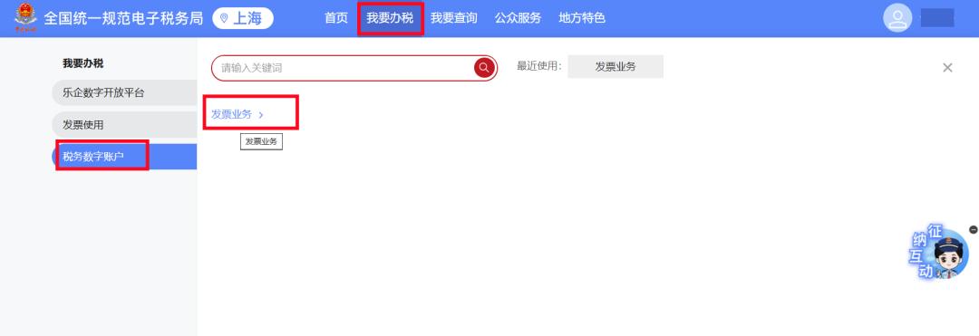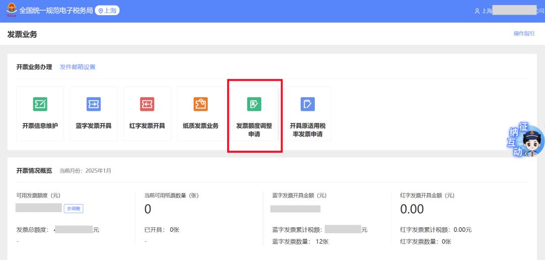 登录新电子税局,依次点击【我要办税】-【税务数字账户】-【发票业务】,进入功能页面,点击【发票额度调整申请】。
