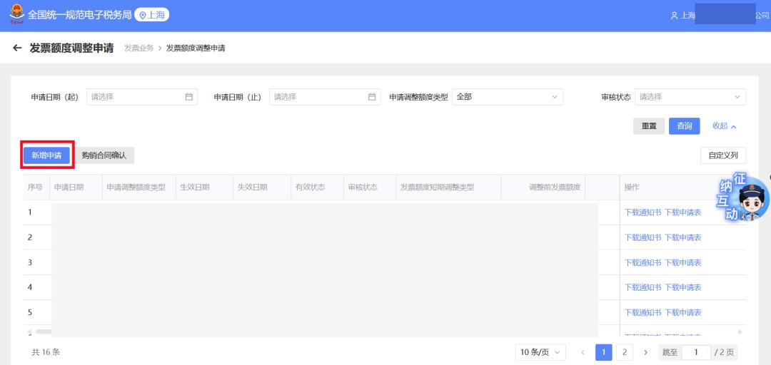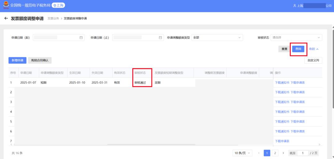 您可返回【发票业务】,在【发票额度调整申请】页面查看发票额度调整情况,包括申请日期、申请调整额度类型、审核状态等。