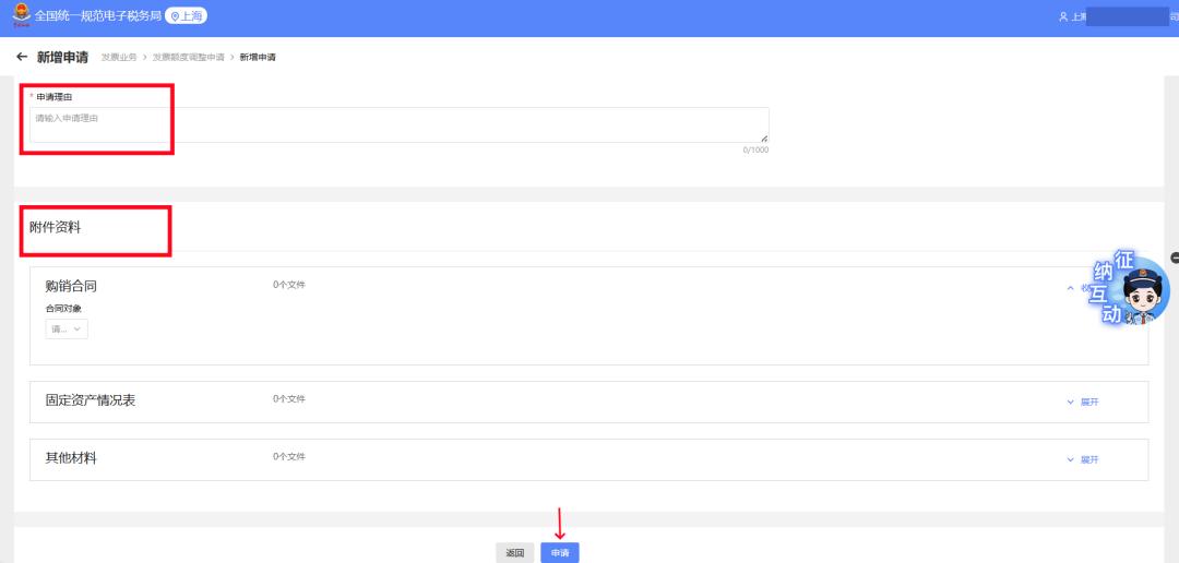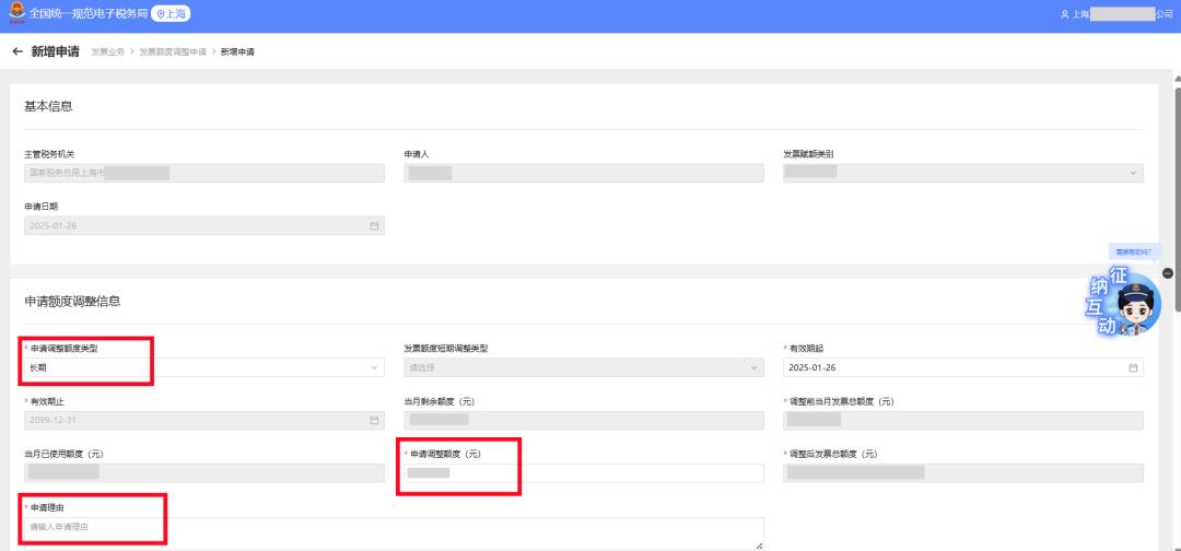 填写申请表,根据实际经营需求,您可以在【申请调整额度类型】选择“长期”或“短期”变动,将本次需要增加的发票额度填入【申请调整额度(元)】,并说明理由、上传附件,最后点击【申请】。