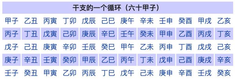 干支纪年就是以十个天干——甲乙丙丁戊己庚辛壬癸,和十二个地支——子丑寅卯辰巳午未申酉戌亥,双排结合往下数,第一年是甲子,第二年是乙丑,以此类推。因为一组是10个,一组12个,60年即一循环。