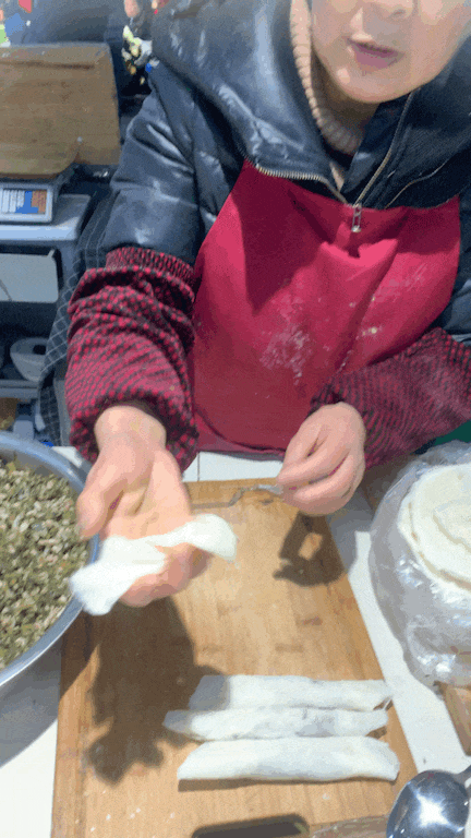 在我的印象中,摊主是一位慈祥的老奶奶。她的面前摆放着一个老式的煤饼炉子,上面架着一只平底锅。老奶奶的动作很是娴熟,只见她左手稳稳握住锅柄,右手拿着一团面糊,灵巧地将面糊在锅的表面轻轻一沾,随即优雅一转,迅速一提。在热气的熏染下,等待上几秒,待面糊成型后再一揭,一张完整的春卷皮就做好了。年味就在这一张张玲珑剔透的春卷皮中,慢慢地来了。