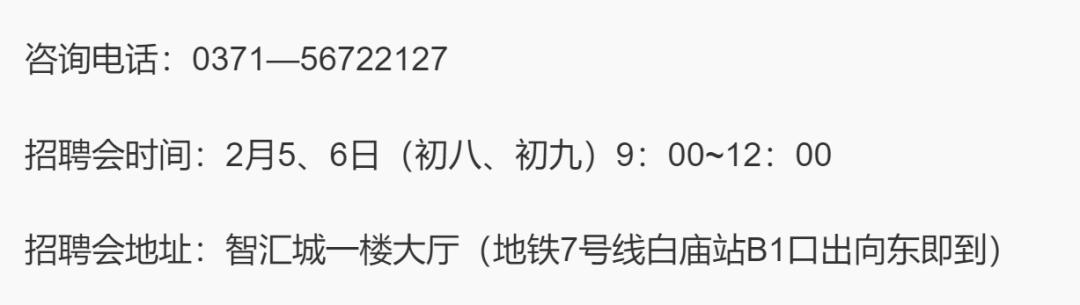 ◆2月5日和6日(正月初八、初九)上午,由郑州市金水区人力资源和社会保障局、金水区东风路街道办事处联合河南123人才网开展的2025年河南省春风行动系列“迎新春·万岗进万家”首场招聘会活动,将在智汇城一楼大厅举行,现场提供岗位16900余个。