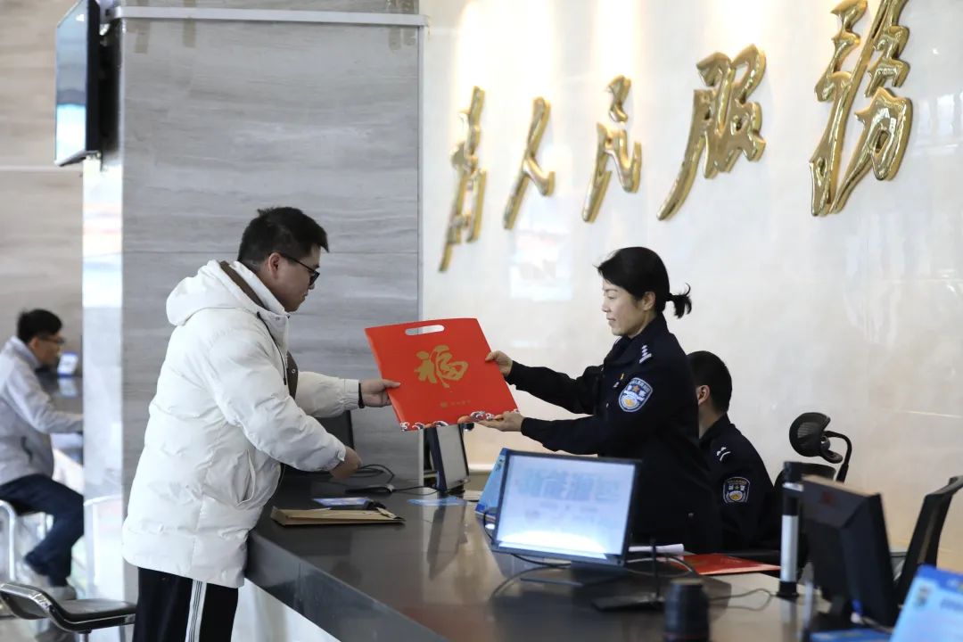 1月28日除夕上午,合肥市公安局车辆管理所,市民孙先生前来办理临时号牌登记业务,顺利办理业务结束后,孙先生还收到了值班民警送上的新年祝福。
