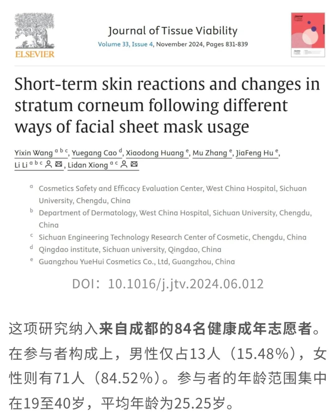 [1] Wang Y, Cao Y, Huang X, Zhang M, Hu J, Li L, Xiong L. Short-term skin reactions and changes in stratum corneum following different ways of facial sheet mask usage. J Tissue Viability. 2024 Nov;33(4):831-839. doi: 10.1016/j.jtv.2024.06.012. Epub 2024 Jun 28. PMID: 38951050.