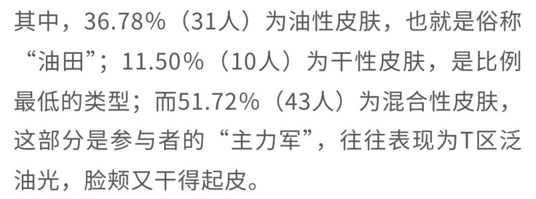 在皮肤类型方面,参与者显示出了一定的差异化特征。