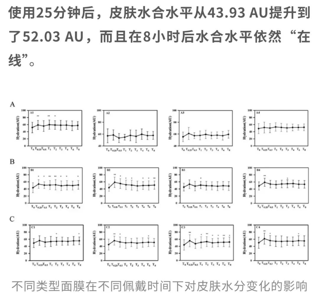 敷上面膜后,所有参与者的皮肤都像久旱逢甘霖一样,水合水平迅速上升。然而,这种效果就像跑短跑,冲刺得快,但没过多久就“体力不支”,水合水平逐渐回落至接近基线的状态。不过,在这场“冲刺赛”中,不同面膜的表现可不一样: