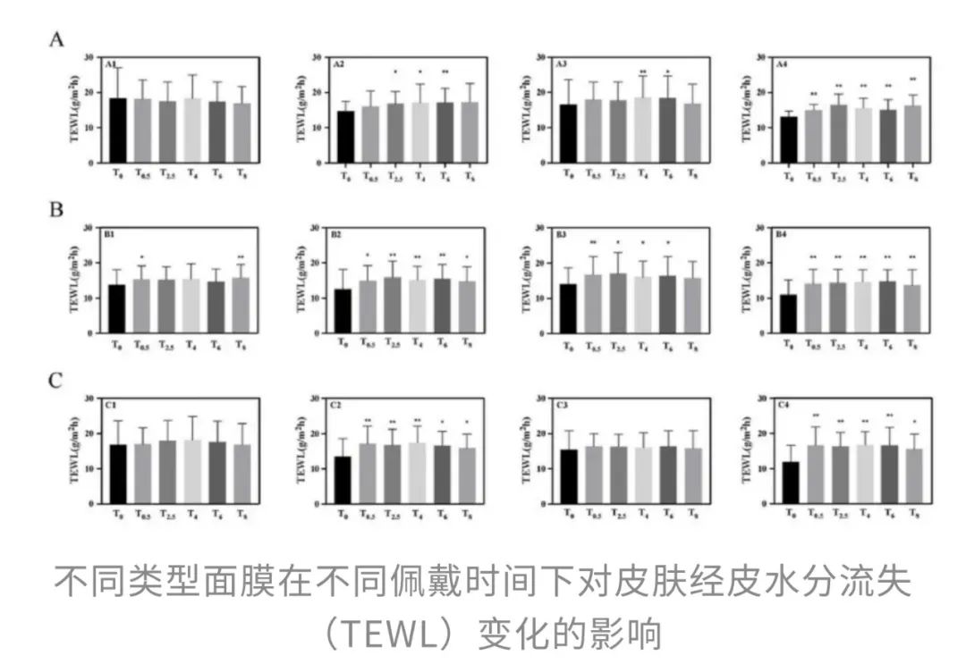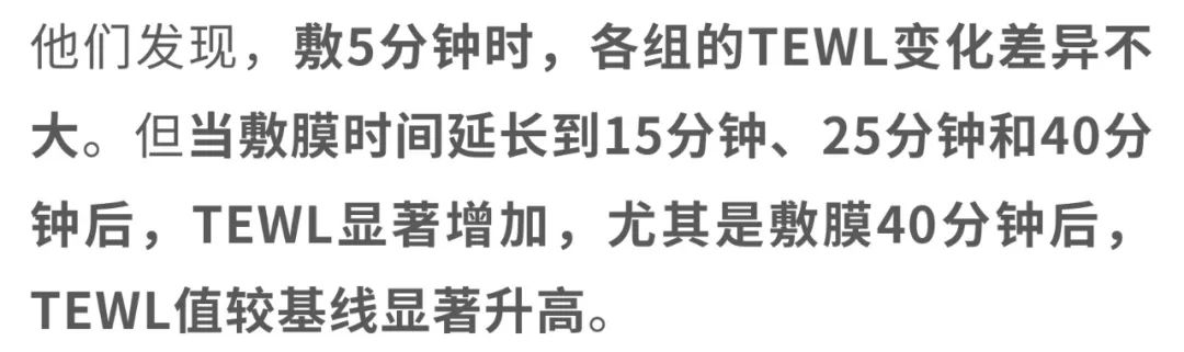 随后,研究人员探讨了不同类型面膜对皮肤水分流失(TEWL)的影响。什么是TEWL呢?简单来说,就是皮肤表面的水分通过角质层蒸发到空气中的过程。就像是水库的水慢慢渗漏一样,TEWL值的增加意味着皮肤的屏障变得“破损”了,原本的水润感也可能随之减弱。