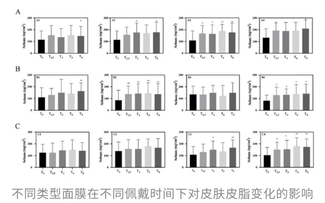 另外,研究还观察了不同面膜能否影响皮肤的皮脂分泌。从结果来看,三种面膜的使用确实对皮肤的油脂分泌产生了影响。特别是在敷了面膜40分钟后,皮脂分泌显著增加,而且这一效应在面膜摘下后的8小时内依然持续存在,仿佛面膜在皮肤上留下了“印记”,让皮脂分泌一直保持活跃状态。这可能导致毛孔堵塞,引起痘痘等皮肤问题。