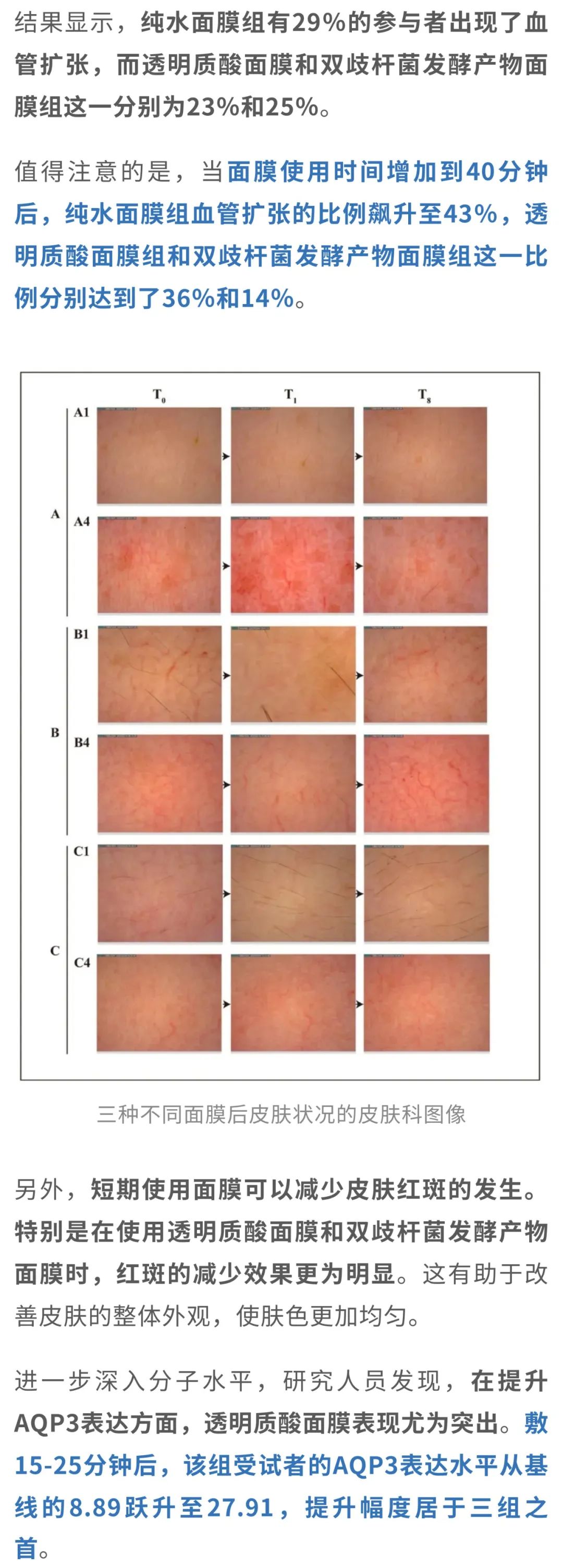 如果研究仅仅停留在对不同类型面膜补水效果的测试,那就未免太“表浅”了。研究人员显然也并不满足于只测试面膜的具体补水效果,他们还观察了敷面膜后皮肤可能出现的临床反应,比如皮肤的血管扩张等。