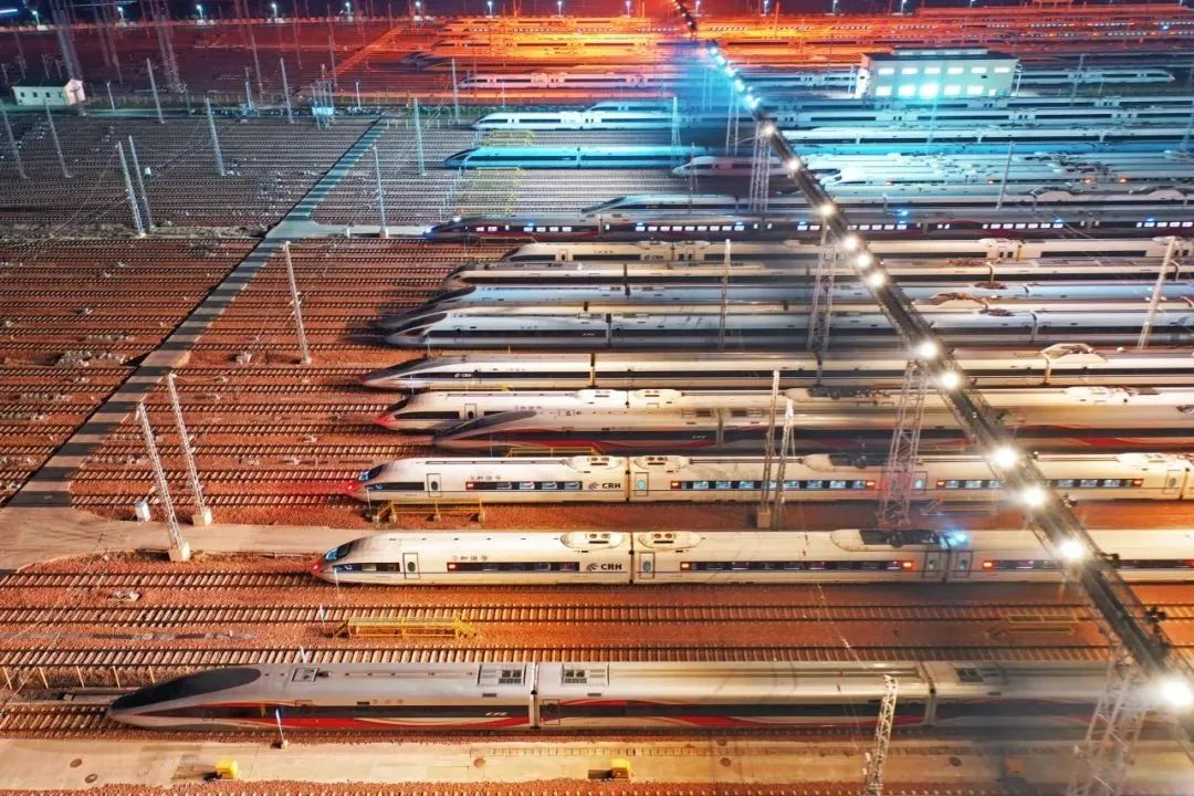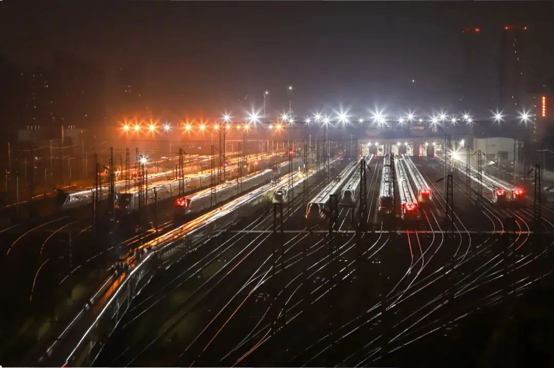 春运期间,忙碌了一天的动车组列车,陆续回到武汉动车段汉口动车运用车间存车场。魏平 摄