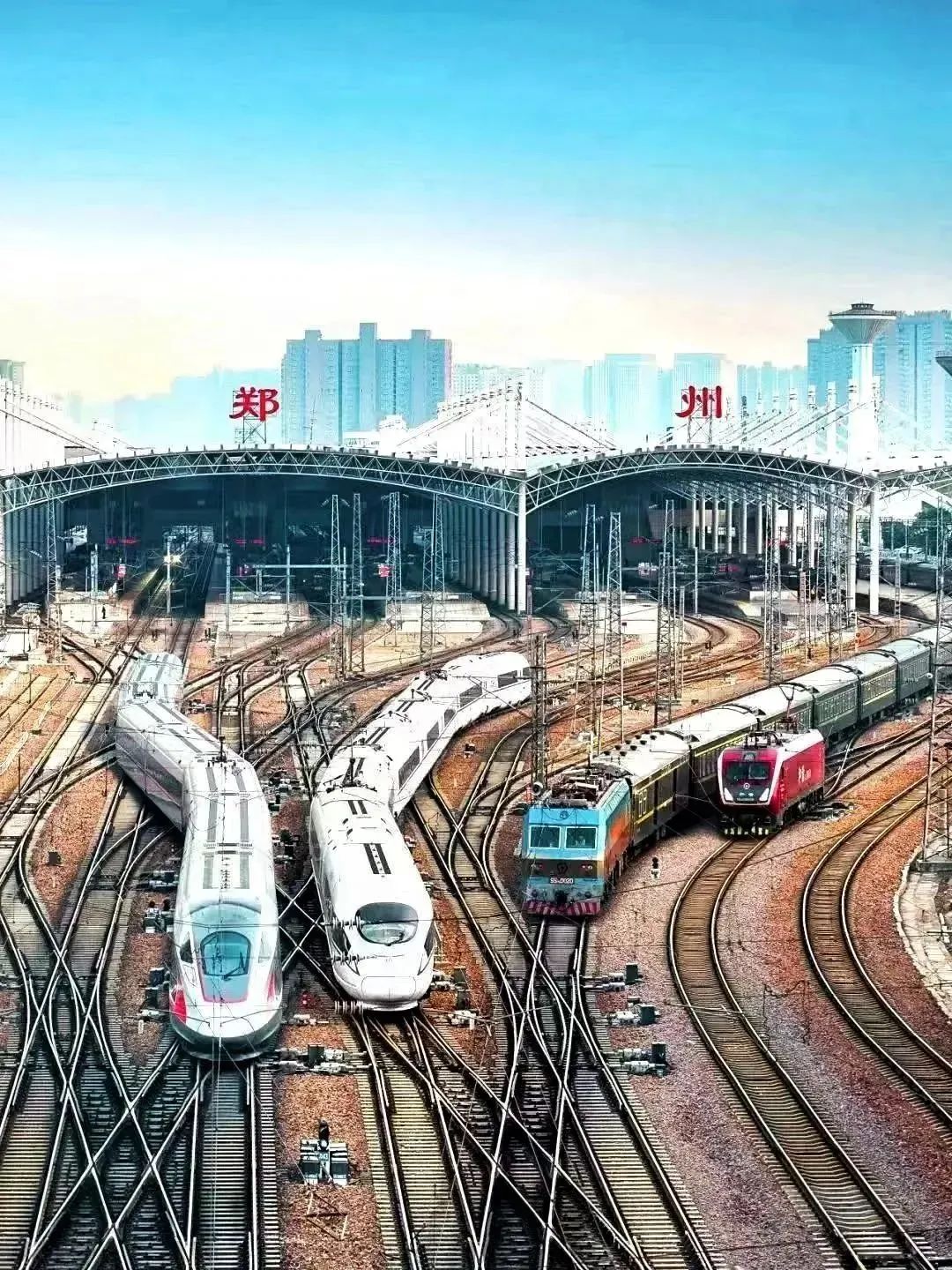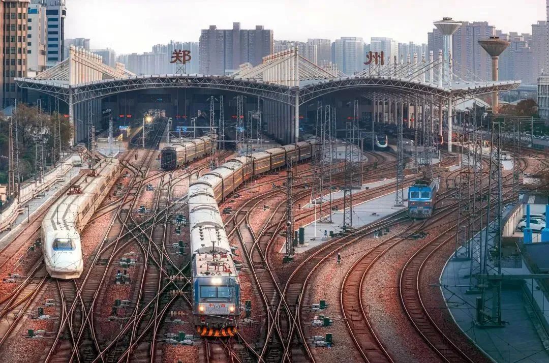 复兴号、和谐号、普速列车、电力机车一同驶出郑州站。胡强 摄