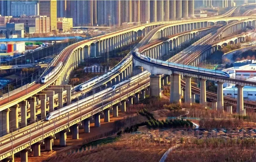 动车组列车与普速列车穿行在城市间。李洪远 摄