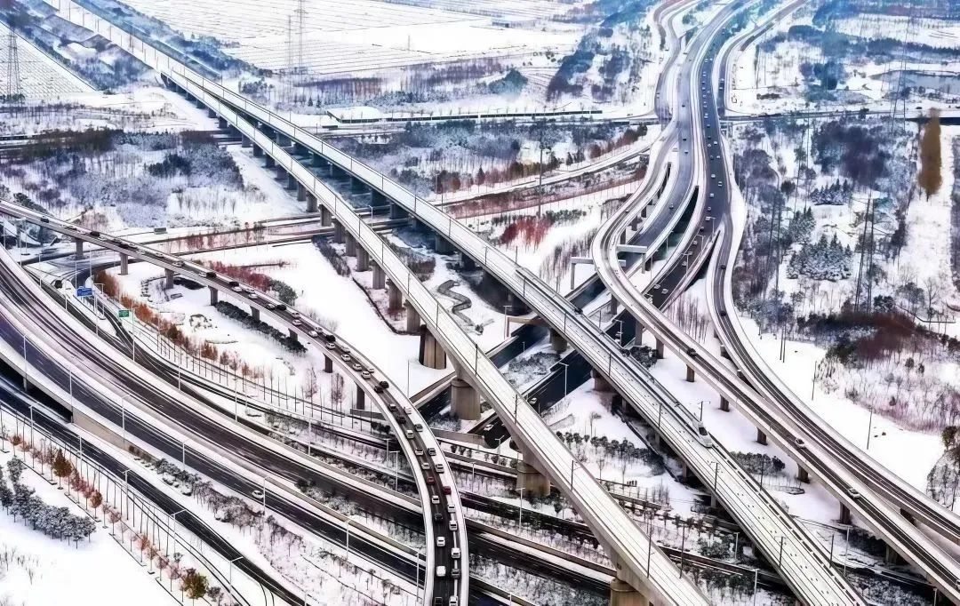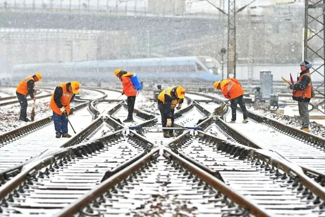 郑州桥工段职工在风雪中检查蜿蜒曲折的铁道线路。王玮 摄