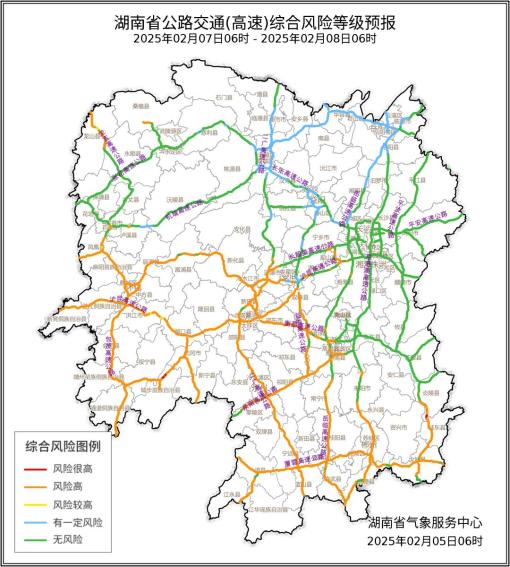2月5日至2月7日湖南省高速公路综合风险等级图公路交通气象影响路段