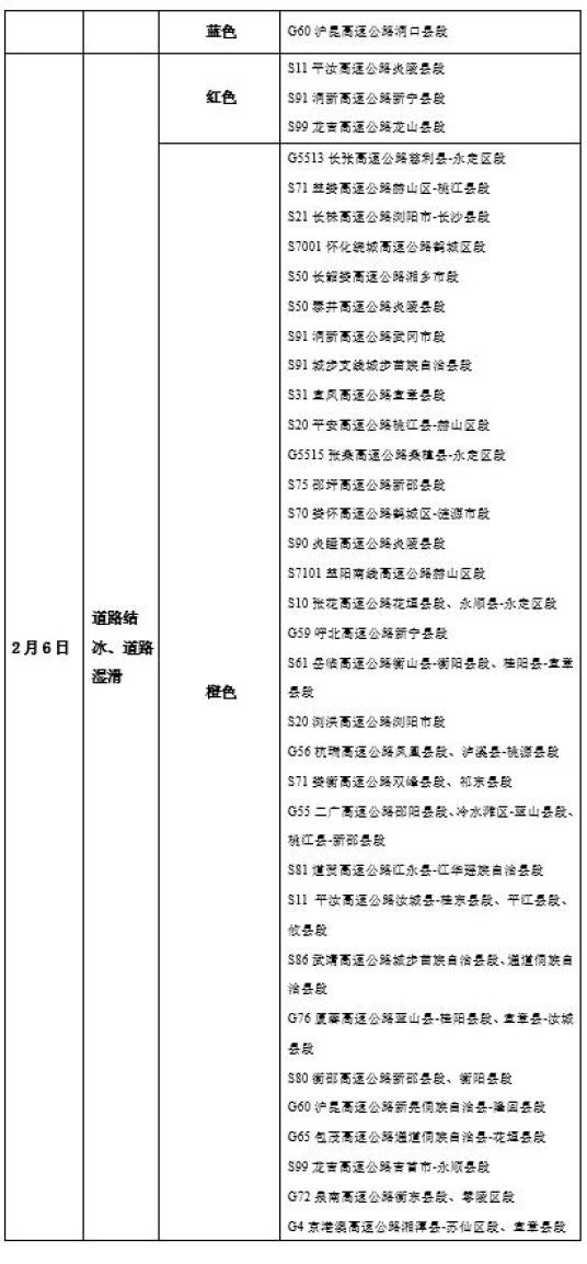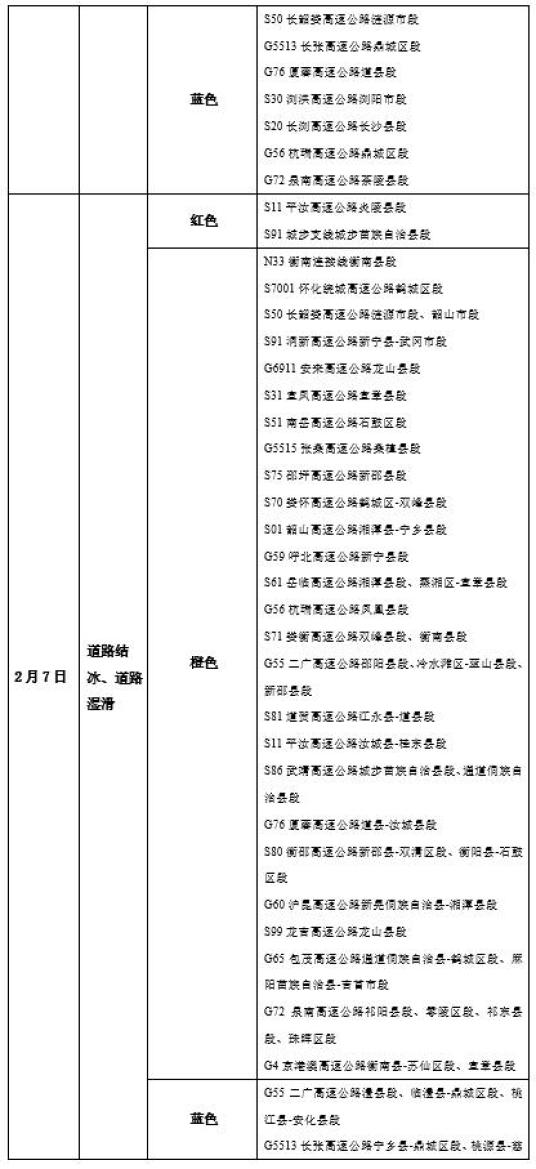 2月5日-7日部分路段受降雨影响,道路湿滑风险大;5日-6日湘西、湘北山区和桥梁路段、7日湘西南和湘南部分路段有道路结冰风险。