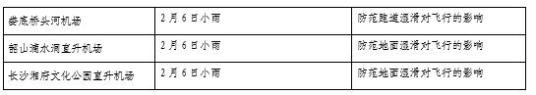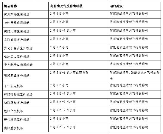 通用航空气象影响预报2月5日湘西地区、2月6日全省大部分地区、2月7日湘南地区降水可能引起跑道湿滑。2月5日-6日湘西部分地区雨夹雪或冻雨天气可能引起跑道结冰。
