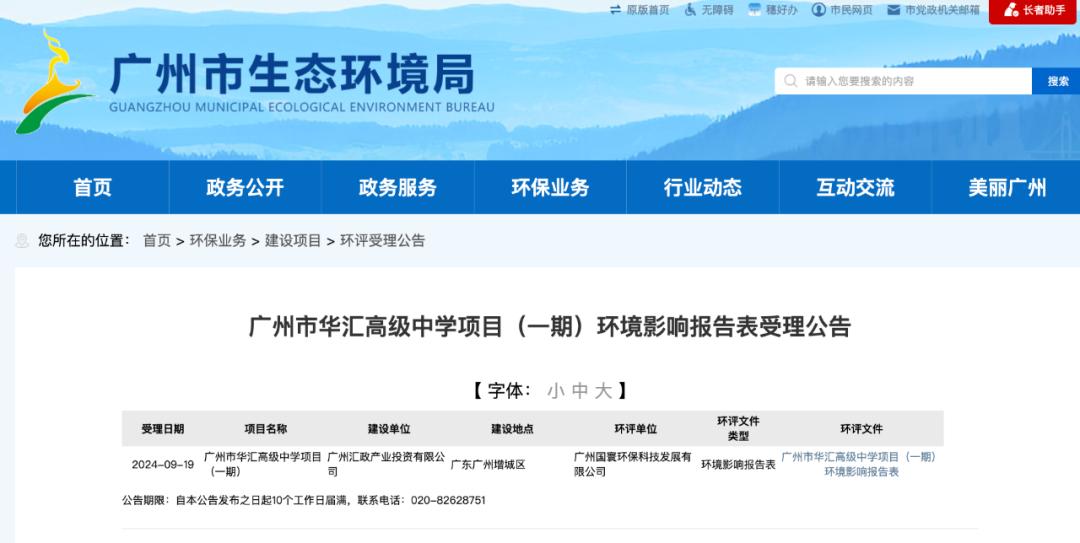 2024年9月,广州市生态环境局官网发布广州市华汇高级中学项目(一期)环境影响报告表受理公告。