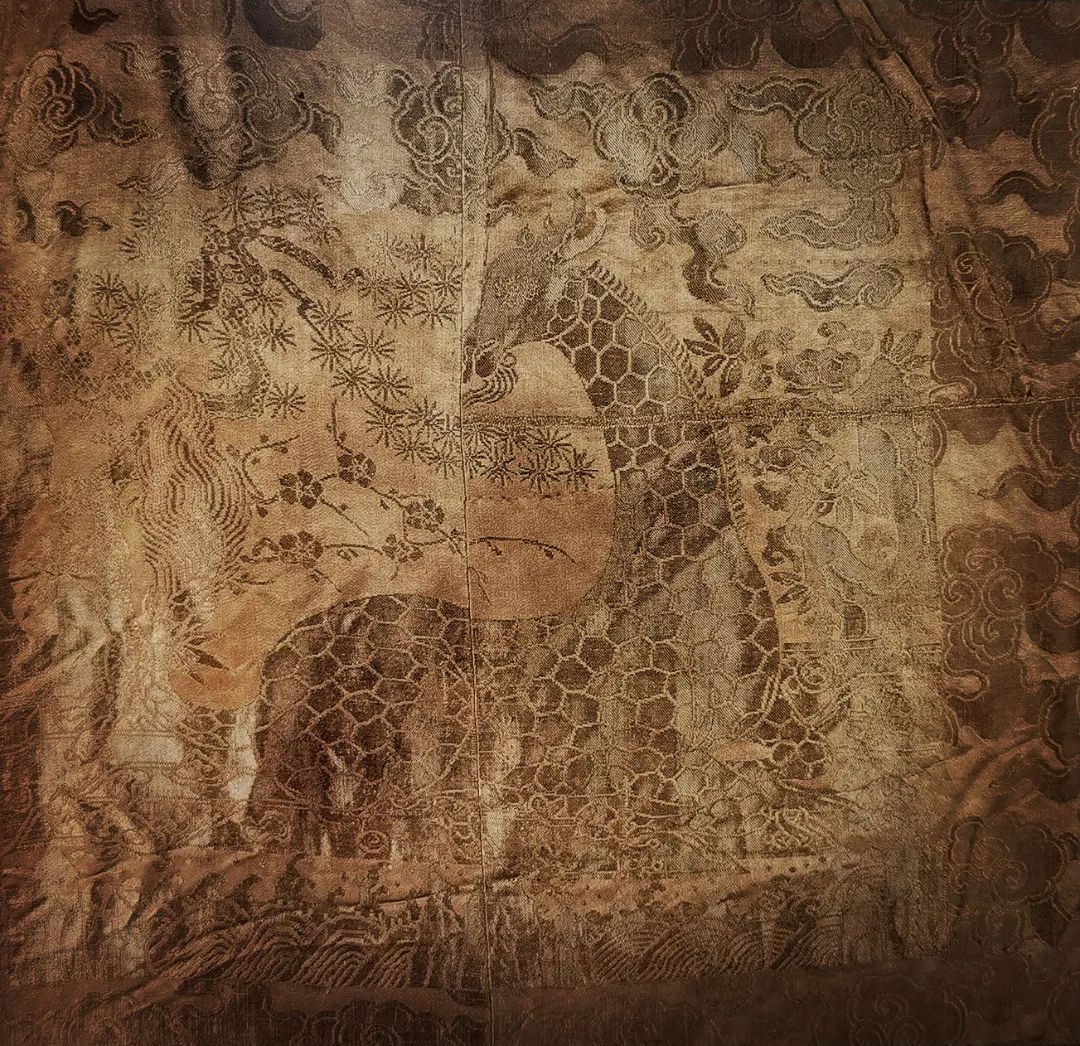 徐俌(1450-1517)是明代开国功臣徐达的第五世孙,16岁袭魏国公爵位,按品阶可穿麒麟补。其墓葬中出土的补服,胸背正中的补子上缀有用片金织成的“天鹿”纹样。