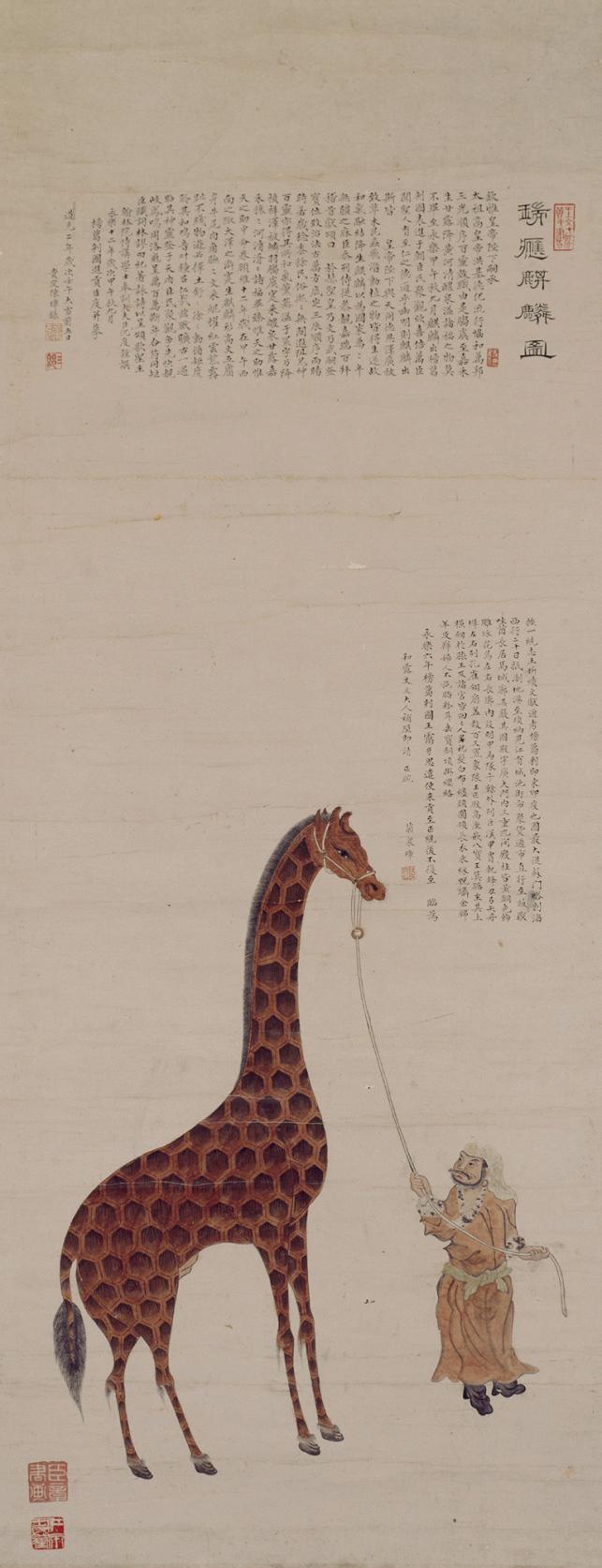 礼部尚书向永乐帝介绍长颈鹿时,将这种异兽称为“麒麟”,皇帝龙颜大悦,当即命宫廷画师创作《瑞应麒麟图》。此画描绘了榜葛剌国(今孟加拉国一带)使臣牵着长颈鹿朝见永乐皇帝的场景:上部附有翰林院修撰沈度所写的《瑞应麒麟颂序》;下部描绘一名身着红色长衫的弁夫牵着一头长颈鹿,长颈鹿体形高大,身上布满六边形网纹。