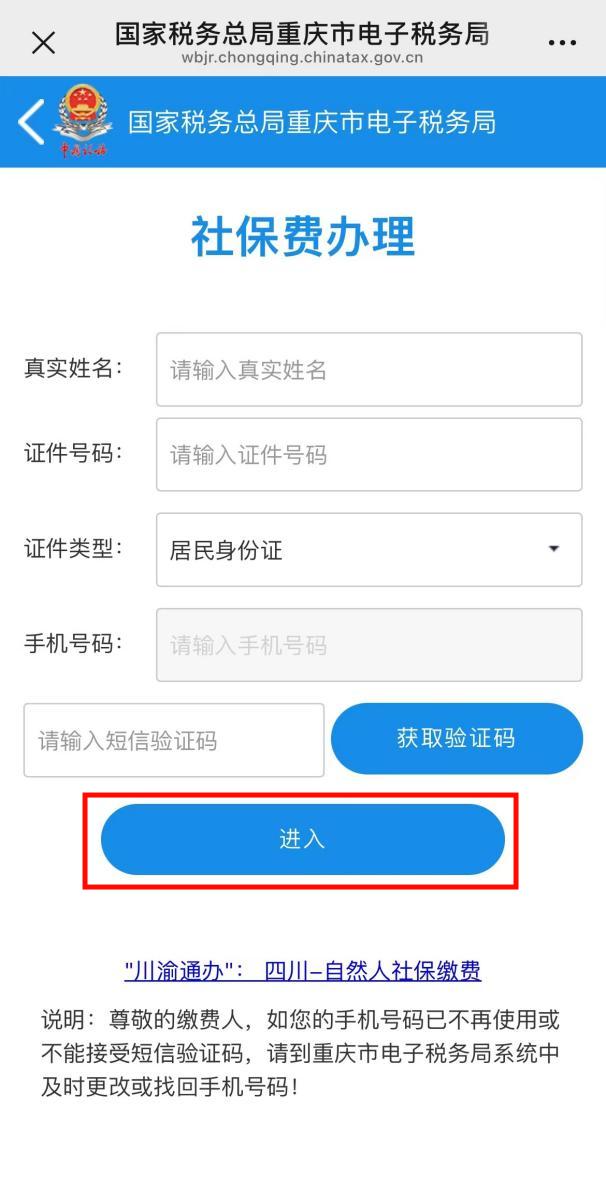 (1)打开“重庆税务”微信公众号,点击页面底部【网上办税】-【个人社保】,依次输入姓名、身份证号、手机号码、验证码等信息后,进入“社保费办理”页面。