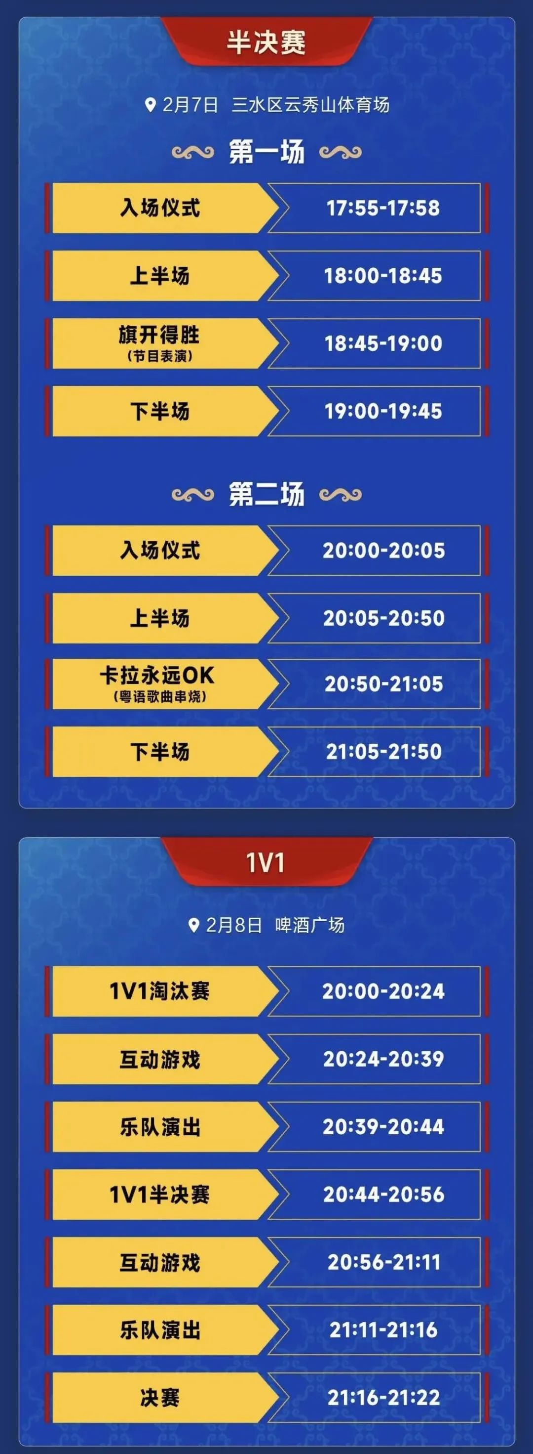 2月6日-2月9日,抖音足球嘉年华佛山站淘汰赛、决赛将在三水云秀山体育场举行。决赛当天,醒狮、英歌舞等11大特色方阵齐上阵,当晚郭艾伦、苏炳添、谢思埸等以及表演嘉宾林晓峰、佛山电翰、江寻千(九月)等将现身。>>详情:佛山发布上下滑动查看比赛日程↓