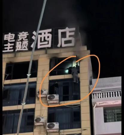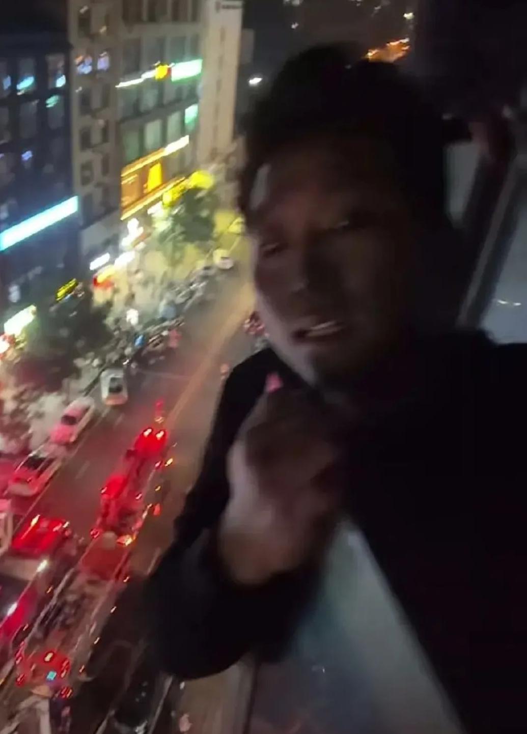 画面中男子被困高楼窗台脸部已被熏黑