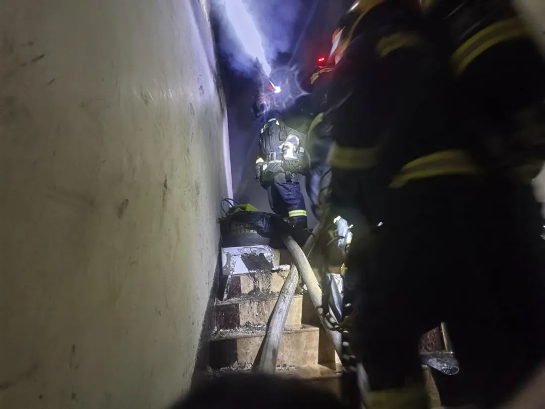 (消防救援通道狭窄)救援过程中,消防队员三人一组解救被困人员。因火灾损毁面积较大,现场空间狭窄,还有大量烟尘没有散去。消防队员只能把楼上的被困人员背下楼,前后各一名护送被困人员免受二次伤害。