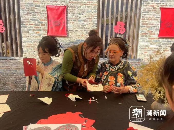 当天,还有来自多个国家的6名外国友人一同相聚于此,体验中国非遗项目。从设计极具特色的中式发型,到身着飘逸的汉服拍照留念,一群外国游客被极致的东方美学狠狠“硬控”。